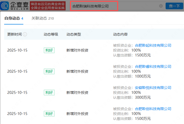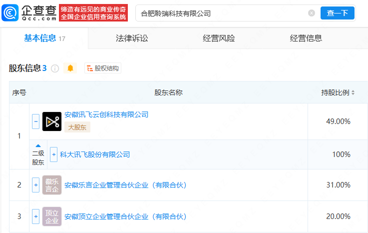 近日股票配资官网行情,合肥聆起科技有限公司、合肥聆睿科技有限公司、安徽聆悦科技有限公司、合肥聆创科技有限公司成立,均由合肥聆瑞科技有限公司全资持股。企查查股权穿透显示,合肥聆瑞科技有限公司由科大讯飞(002230)全资子公司安徽讯飞云创科技有限公司等共同持股。