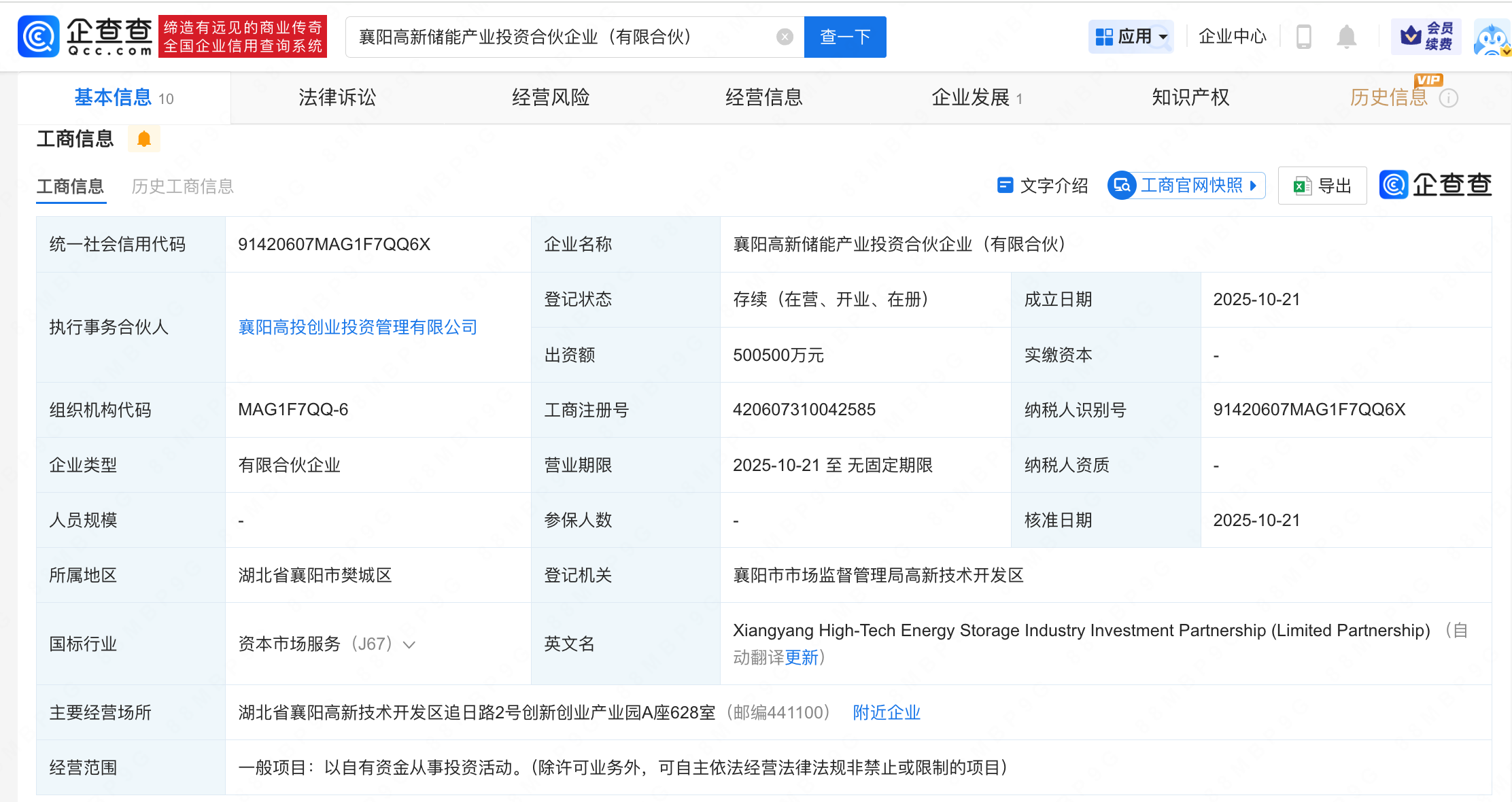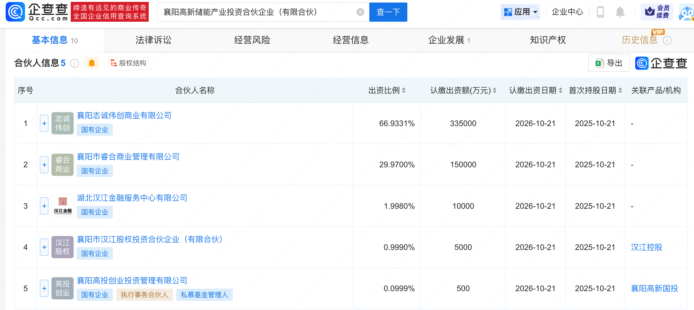 近日,襄阳高新储能产业投资合伙企业(有限合伙)成立,执行事务合伙人为襄阳高投创业投资管理有限公司,出资额50.05亿人民币,经营范围为以自有资金从事投资活动。企查查股权穿透显示山东配资公司,该企业由襄阳市汉江股权投资合伙企业(有限合伙)、襄阳志诚伟创商业有限公司、襄阳高投创业投资管理有限公司等共同出资。